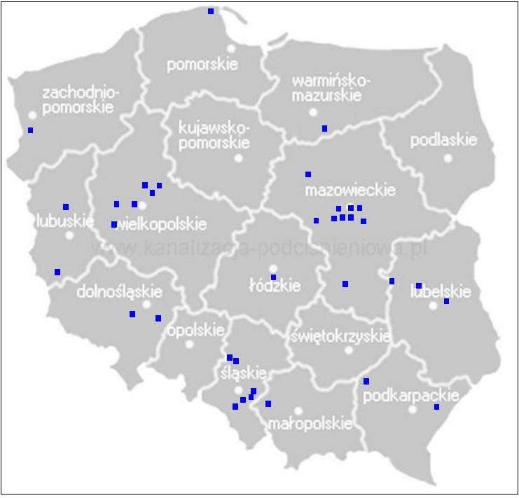 rys.3 – mapa Polski z zaznaczonymi lokalizacjami systemów kanalizacji podciśnieniowej